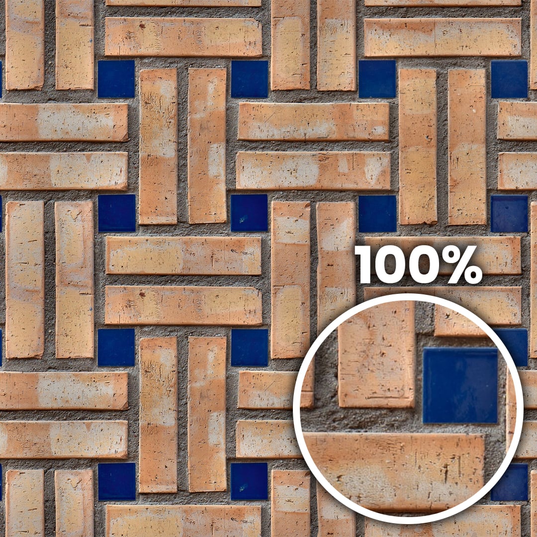 Close-up of a decorative crosshatch brick wall with additional glazed blue squares elements