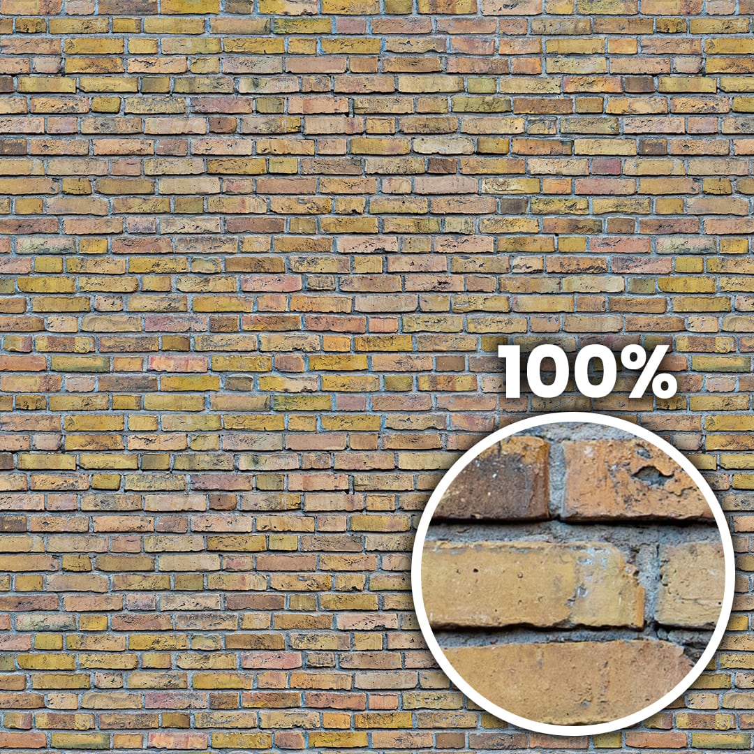 This decorative brick wall has bricks with warm ochre tones with lots of irregularities.
