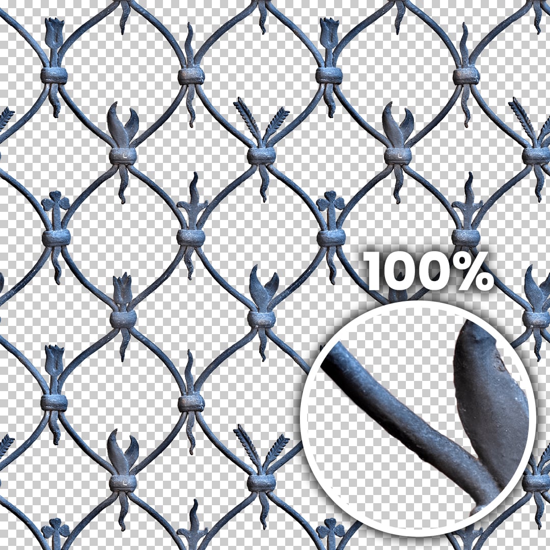 This old wrought iron gate seamless texture showcases handmade floral elements and gracefully waving iron rods, highlighting intricate craftsmanship and vintage ornamental detail. Most of the surface of the texture is see-through.