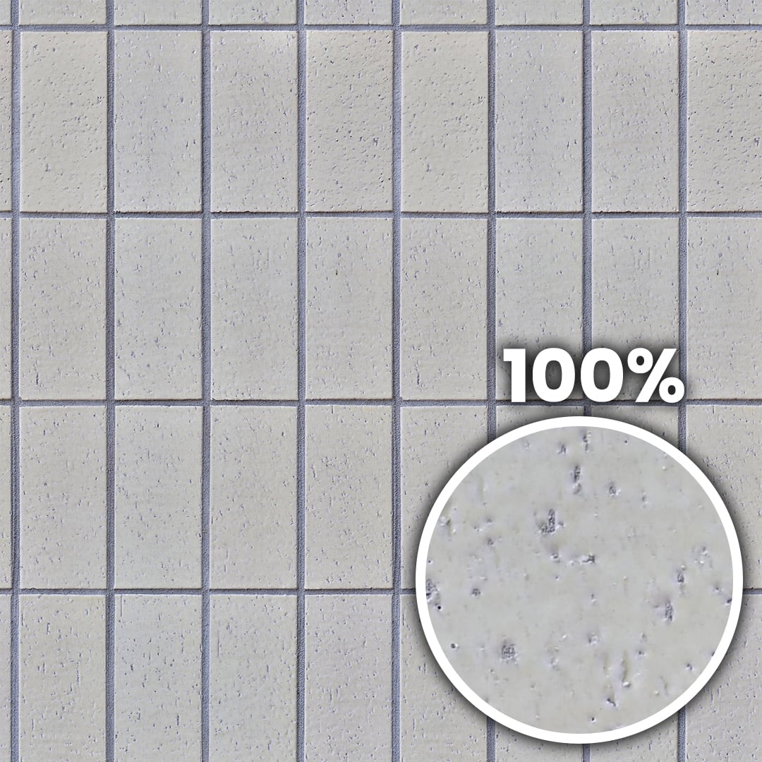 A seamless texture of an exterior wall covered in vertically arranged glazed tiles with a porous surface and light grey grout lines. Perfect for realistic 3D visualizations and architectural renders.